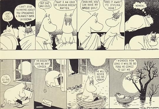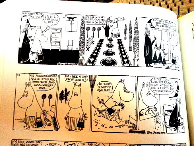 I discovered the world of Moomin through this book. The library where I worked received it and one of my coworkers hung the included poster in her cubicle. We were both so charmed by the illustrations we had to read the books. Both the chapter books and the comics are wonderful, touching, and deeper than you'd assume at first and I highly recommend reading both. This collection is a perfect way to experience the comics. They're all here, and in order (minus the strips Lars did once Tove left--they have their own volume now). The book itself is a beautiful thing--large, but not so big or awkward that you can't read it comfortably (an issue I have with the giant Calvin and Hobbes collection and the annotated Sandman volumes) and well-bound. I had so many moments of recognition while reading. Jansson is one of those writers who can capture an entire mood in a single sentence or panel. I found myself photographing panels to show to others, saying, "That's me!"