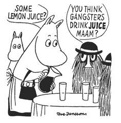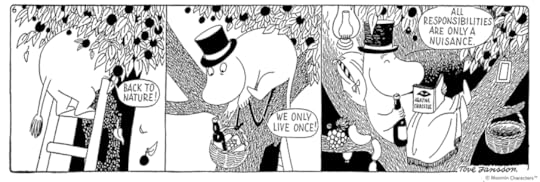 I loved the Moomin animated series as a child. So naturally I had to read this. The Moomin comics and the children's show are like day and night. The real Moomin comics are not for children. I laughed the whole entire time. In one short, Moominpappa convinces Moominmama to abandon their son. They steal, they break laws, they go on adventures, Moominpappa even distills his own whiskey. A man of culture Moominpappa just wants to write his autobiography. Moominmamma is the best character because she has the patience of a saint. If anybody pulled any of the stunts that her husband or son did I'd be livid. Baby Moomin isn't much of a baby. He's a full grown adult named Moomintroll who complains too much yet somehow has a girlfriend named Snorkmaiden. In all their adventures they are always getting into trouble or creating chaos. I love it. They're hilarious.