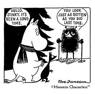 I'd never read anything like this. The care-free nature and adventures in the stories were a perfect way for me to unwind, and beyond that escapism there was a very personal and identifiable touch in the characters and stories. Often certain characters will refer directly to the reader (in one of the later stories, when it begins with Moomintroll's rear, he explains that he's looking for an adventure, as that's what the readers want, with him and Moominpappa then looking towards the reader in fear). Another of my favourite examples is Moominmamma throwing dirt through her tidy and orderly neighbour's window saying '...why don't you live in a plastic bag yourself, madame?'.