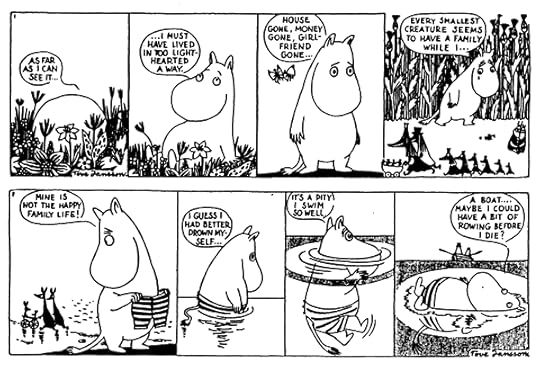 It's baffling to realise these were published in newspapers. Can you imagine reading a newspaper comic section and getting something this funny? I don't really care about comics so when I dip my toes it's usually the stuff that has prestige to become "a comic for non comic readers", like Watchmen or The Invisibles or some big name spin off artsy short run stuff. And that sort of understanding gives you a weirdly skewed view of comics as only being great when they have lots of words and are very serious. And the Moomin comics are like a repudiation of that: they're genius comics as comics on their own terms. You couldn't do deep literary analysis of them but they're brilliantly crafted, perfectly consistent in tone throughout, yet constantly surprising in a way that delights rather than unnerves or jars.