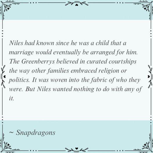 -Snapdragons, is such a beautiful story with such heart! This dear story will touch on every heartstring, as it’s a delightful story full of every emotion, witty banter, fun scheming and antics, dear relationships, best interests at heart, and even miracles weaved throughout. The characters are endearing and full of such goodness. They feel like cherished friends. I love watching what happens when Niles and Penelope do end up meeting. Their astonishment with how well-suited they to each other, will have your full attention. Things get even more charming and adventurous when more of Niles’s friends show up as an inexpert courtship takes place. What I loved most was watching two dear individuals fighting for opposing futures discover and come to find in each other, the happiness they both have dreamed of! Dear friends, this is not a story to miss. It’s well-written, and could easily be read as a stand alone but, I would encourage you to greatly read the series in order to fully love and appreciate the whole beautiful stories, relationships, and characters! Well-worth the read, any day, friends!📚❤️✨