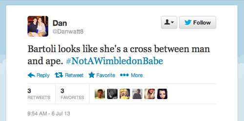 As you may know, every so often I do a review about misogyny, just because it is the gift that keeps giving. There’s always something to say, its adherents are constantly finding new and unexpected opportunities to express themselves. Who would, for instance, have thought that the recent Wimbledon Ladies Singles final would have sparked off such a torrent of grisly hatred on Twitter, but it did. The focus of the male rage was the winner, Marion Bartoli, who was perceived to be fat and ugly and therefore offensive to the male viewers. That was her crime. This is she