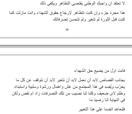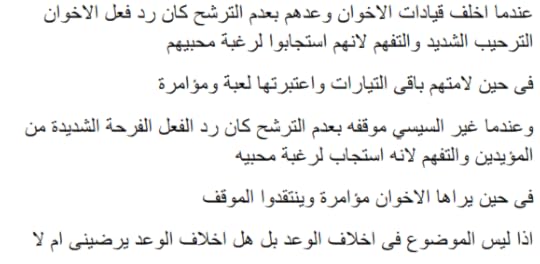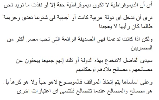 الكتاب في سطور رائع جدا في الحقيقة انتي لم تكتبي خواطر سياسية انتي كتبتي كتاب في جزئية معينة وقمتي بتشريح الحالة السياسية والعقلية في مصر اخدتي دور الطبيب المعالج والطامح في نفس الوقت لمشاهدة نتائج العلاج كتابك رائع جدا الذي جعل منه يكتسي ثوب الروعة هو إسلوبك المميز ولغتك الجميلة جدا السهل الممتنع انتي اديتي هذا النقطة بطريقة جميلة جدا ليس غريب على بنت النيل هذا فانت بصريحة العبارة اجدتِ بحق في الوصف الكلي لما تعيشه بلدك من تخبط ومخاض عسير جدا خاصة في الجانب السياسي .