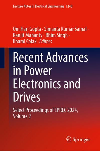 This book entitled “Recent Advances in Power Electronics and Drives - select proceedings of EPREC-2024 provides the rigorous discussions, case studies, and recent developments in the emerging areas of power electronics, especially, power inverter and converter, electrical drives, regulated power supplies, electric vehicle and its charging infrastructure, etc. There are two main problems with the electric vehicle (EVs) technology, which are associated with the range anxiety, charging spot and time. These problems can be taken care of with having a good charging infrastructure, which provides ways to improve the environmental conditions and make sure to mitigate these issues. The same issues would be addressed via this book. The readers would be benefited in enhancing their knowledge and skills in the domain areas. Also, this book may help the readers in developing new and innovative ideas. The book can be a valuable reference for beginners, researchers, and professionals interested in advancements in power electronics and drives.