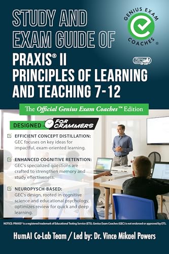 Full and updated Review core concepts of teaching and learning, ensuring a robust understanding of the content assessed in the Praxis II exam.Visual Each chapter commences with visually engaging mind maps, leveraging brain science and learning psychology to enhance memory, comprehension, and engagement.Research-based study Make the most of your study time with Learning Boxes, which stimulate critical thinking, provide concise summaries of key takeaways, and offer inspiration through quotes and study tips.Optimal Navigate complex subjects effortlessly with a streamlined 3-step review, recognition, and recall process that makes studying both manageable and rewarding.Chapter Wrap up each chapter with handy checklists, allowing you to review key concepts and reinforce understanding through active recall and elaboration.Lead the next generation of young minds by becoming an effective educator with the Study and Exam Guide of Praxis II Principles of Learning and Teaching 7-12. With this comprehensive guide and the support of Genius Exam Coaches, you'll be well-prepared to conquer the exam and advance your career in education!