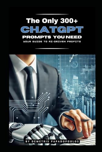 Inside This Book, You'll Proven Strategies: Learn how to harness ChatGPT for various applications, from content creation and marketing to education and business development.Diverse Income Opportunities: Explore multiple ways to monetize ChatGPT, including writing eBooks, creating marketing copy, offering tutoring services, developing online courses, and more.Expert Tips and Tricks: Gain insights from an industry veteran with over a decade of experience in online business, ensuring you get the most out of each prompt.Customizable Prompts: Tailor the provided prompts to fit your unique style and business goals, allowing for endless possibilities and creative freedom.Scalable Solutions: Discover methods to scale your efforts and grow your income over time, making AI a sustainable and profitable part of your business strategy.Why This Book?In a world where content is king and efficiency is crucial, "The Only 300+ ChatGPT Prompts You Your Guide to AI Profits" stands out as the definitive guide for anyone looking to leverage AI for financial gain. Demetris Papadopoulos brings his wealth of knowledge and experience to the table, ensuring you have all the tools you need to thrive in the digital economy.