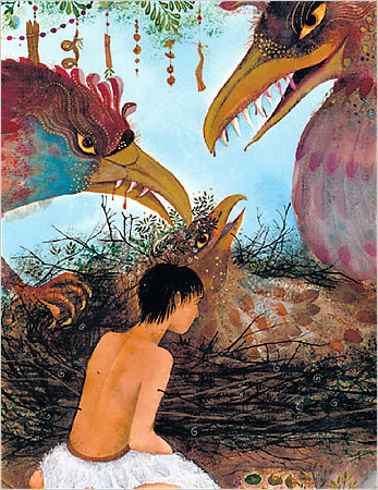 This warmly worded and intricately illustrated epic enchants our daughters with its exotic beauty and its underlying themes of kindness and generosity, in spite of its war and gore and shark-toothed, eagle-taloned Anzu birds.