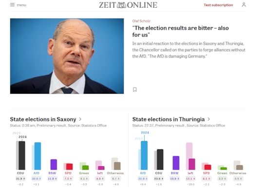 "Almost all the relevant lines of the conflict in the Federal Republic can be traced back to Thuringia. The local protagonists Bodo Ramelow, Björn Höcke and Thomas Kemmerich are known far beyond the country's borders. But Thuringia has always been special: Bach was born here, Luther translated the New Testament, Goethe and Schiller wrote important works, the Bauhaus was founded, the Weimar Republic was formed- and Hitler found his model district. Now the right-wing estremist AfD could take power in the country that is governed by Germany's only left-wing prime minister- and fundamentally change the political architecture of the Federal Republic"
