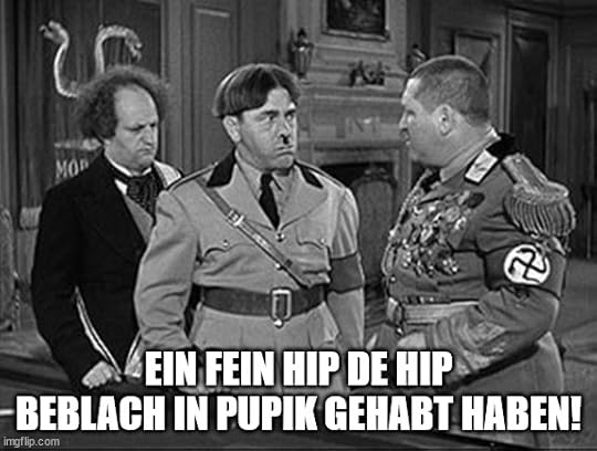 [1]: The irony here is that some of his phrases in the shorts where the Stooges were skewering the Nazis were Yiddish or Hebrew with German inflections which I'm sure was a nice touch for their Jewish audience. E.G.: "Beblach" means "beans" and "in pupik gehabt haben" means "I've had it in the bellybutton."