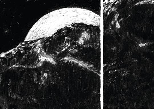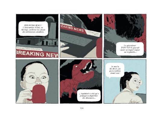 Une autre BD piochée aux Utopiales cette année, au format inhabituel (24.9 x 3.1 x 17.9 cm), aux belles trouvailles du point de vue de la mise en page et de la palette choisie, avec des couleurs fortement associées à leur environnement émotionnel ! Tons rouges et beiges pour le magasin "Eaki", un noir et blanc pour l'intérieur du vieil homme malveillant, de magnifiques flocons bleus sur fond noir, jaunes chauds pour la réunion des paroissiens, dessins au crayon à papier au trait nerveux pour l'astéroïde qui approche de la Terre inéluctablement, et un bleu très reconnaissable pour les sites en extérieur, dont l'une figure en couverture. Enfin, une très belle alternance de blancs et de bandes de couleur pour les passages de blanc de Floyd, le colosse amnésique.