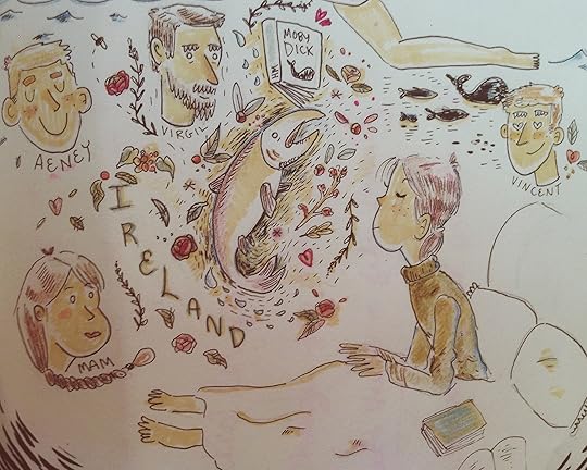 "I lay in his lap and he read and we sailed off elsewhere. Dad and I went up the Mississippi, to Yoknapatawpha County, through the thick yellow fog that hung over the Thames or in through those dense steamy banana plantations all the way to Macondo. We went in the large lumpy blanket-covered Sugan boat-chair that was placed in by the Stanley range where our cribs were put to keep us warm and where Aeney slept like the Pope Nan said but I cried and was lifted, swaddled in West Clare Tropic, sucked my tiny thumb and was ready for departure."