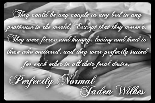 Perfectly Normal takes place in the time between the last chapter and the epilogue of The Beast. It starts with Dimitri, Columbia and... oops...I almost said his real name.. the concierge living in Hong Kong. The concierge is training Columbia on how to fight, not only to protect herself, but also how to kill. She wants to learn, not only for her own safety, but so she can be the one to kill Dimiti's ex boss, Sergei. This book was full of passion, OMG the passion between Dimi and Columbia is off the charts HOT, hot sex, again...OMG the sex was hot(one scene in particular), suspenseful and action packed. This book had me needing a wardrobe change, more than once, and near the end I thought I might die from all of the suspense! If I didn't fall in love fully with Dimi and Columbia in The Beast, I'm head over heals in love with them now, the concierge too. I know their brand of love is frowned upon and they are ruthless killers, but blame it on the beautifully amazing writing skills of the A-Freakin-Mazing, Jaden Wilkes!