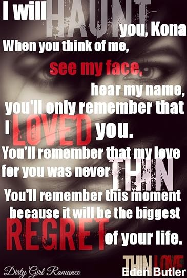 “I will haunt you, Kona. When you think of me, see my face, hear my name, you’ll only remember that I loved you. You’ll remember that my love for you was never thin. You’ll remember this moment because it will be the biggest regret of your life.”