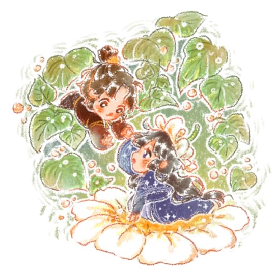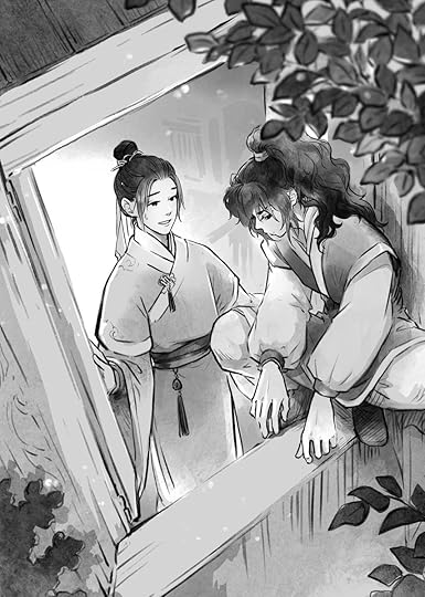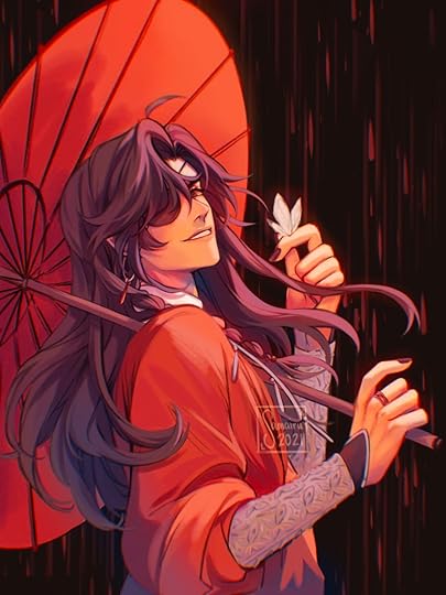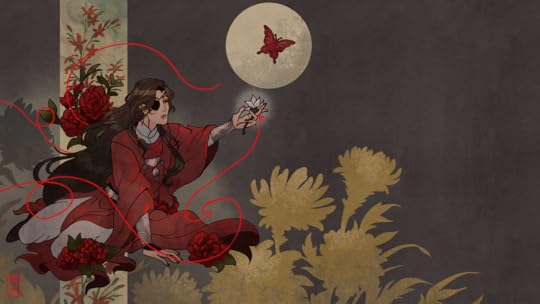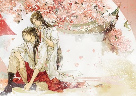Xie Lian slowly approached Hua Cheng. He saw that the man's shoulders had a few red blossoms scattered on them, and he wanted to brush them off for him, but he realized that gesture would be overly intimate. So he forced down the urge and tucked his arms behind his back, smiling.