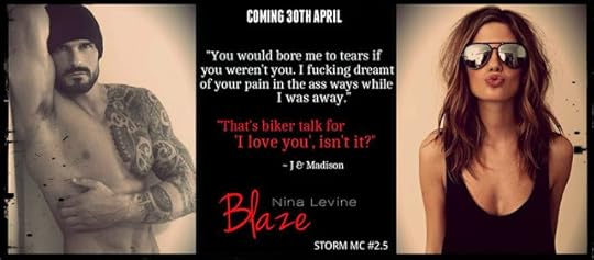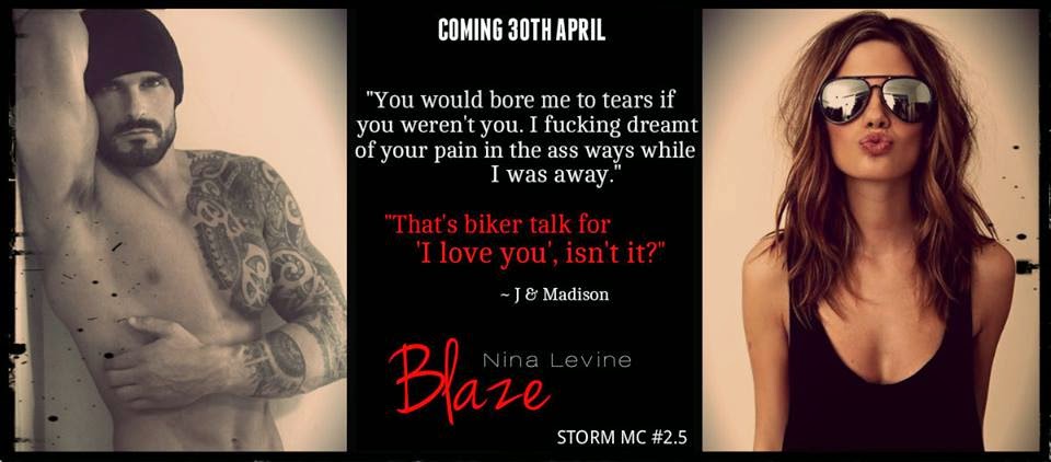 Madison and Jason are back in this steamy hot novella, Blaze (Storm MC 2.5) by Nina Levine. The story begins with a flashback to Madison's 23rd birthday and the powerful love that had ignited between the couple. J and Madison are good friends and the thought of taking their relationship to the next level causes Madison to put the brakes on. She doesn't want to lose him because he is too important to her. J tries to explain that she is the only one for him.