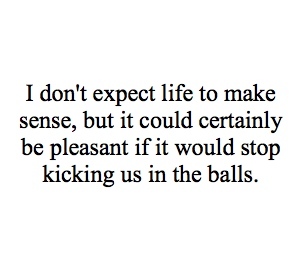 “I don't expect life to make sense," he said after a few moments, "but it could certainly be pleasant if it would stop kicking us in the balls.”