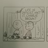 Charles Monroe Schulz was an American cartoonist, whose comic strip Peanuts proved one of the most popular and influential in the history of the medium, and is still widely reprinted on a daily basis. Schulz's first regular cartoons, Li'l Folks, were published from 1947 to 1950 by the St. Paul Pioneer Press; he first used the name Charlie Brown for a character there, although he applied the name in four gags to three different boys and one buried in sand. The series also had a dog that looked much like Snoopy. In 1948, Schulz sold a cartoon to The Saturday Evening Post; the first of 17 single-panel cartoons by Schulz that would be published there. In 1948, Schulz tried to have Li'l Folks syndicated through the Newspaper Enterprise Association. Schulz would have been an independent contractor for the syndicate, unheard of in the 1940s, but the deal fell through. Li'l Folks was dropped from the Pioneer Press in January, 1950. Later that year, Schulz approached the United Feature Syndicate with his best strips from Li'l Folks, and Peanuts made its first appearance on October 2, 1950. The strip became one of the most popular comic strips of all time. He also had a short-lived sports-oriented comic strip called It's Only a Game (1957–1959), but he abandoned it due to the demands of the successful Peanuts. From 1956 to 1965 he contributed a single-panel strip ("Young Pillars") featuring teenagers to Youth, a publication associated with the Church of God. Peanuts ran for nearly 50 years, almost without interruption; during the life of the strip, Schulz took only one vacation, a five-week break in late 1997. At its peak, Peanuts appeared in more than 2,600 newspapers in 75 countries. Schulz stated that his routine every morning consisted of eating a jelly donut and sitting down to write the day's strip. After coming up with an idea (which he said could take anywhere from a few minutes to a few hours), he began drawing it, which took about an hour for dailies and three hours for Sunday strips. He stubbornly refused to hire an inker or letterer, saying that "it would be equivalent to a golfer hiring a man to make his putts for him." In November 1999 Schulz suffered a stroke, and later it was discovered that he had colon cancer that had metastasized. Because of the chemotherapy and the fact he could not read or see clearly, he announced his retirement on December 14, 1999. Schulz often touched on religious themes in his work, including the classic television cartoon, A Charlie Brown Christmas (1965), which features the character Linus van Pelt quoting the King James Version of the Bible Luke 2:8-14 to explain "what Christmas is all about." In personal interviews Schulz mentioned that Linus represented his spiritual side. Schulz, reared in the Lutheran faith, had been active in the Church of God as a young adult and then later taught Sunday school at a United Methodist Church. In the 1960s, Robert L. Short interpreted certain themes and conversations in Peanuts as being consistent with parts of Christian theology, and used them as illustrations during his lectures about the gospel, as he explained in his bestselling paperback book, The Gospel According to Peanuts, the first of several books he wrote on religion and Peanuts, and other popular culture items. From the late 1980s, however, Schulz described himself in interviews as a "secular humanist": “I do not go to church anymore... I guess you might say I've come around to secular humanism, an obligation I believe all humans have to others and the world we live in.”