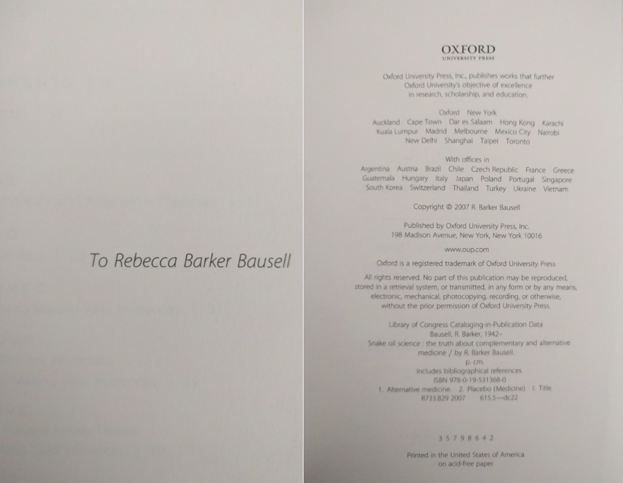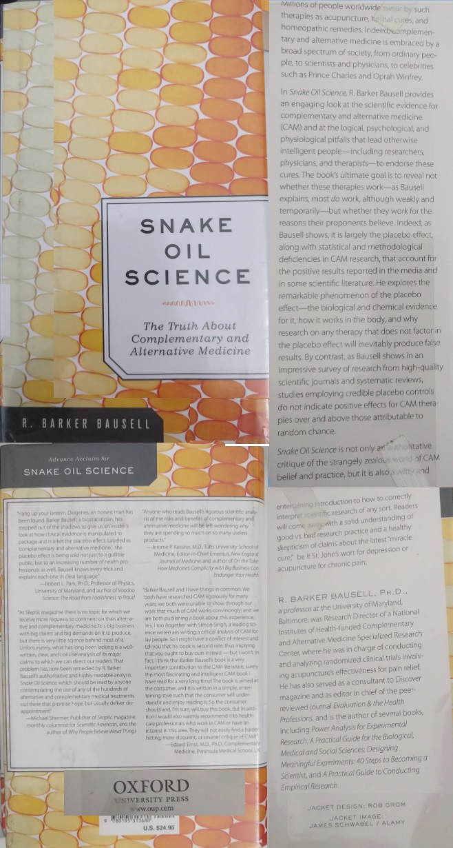 Snake Oil Science is most helpful for those who want to learn about research methodologies – or lack thereof – behind CAM therapies. Bausell provides numerous citations for those who want to learn more about individual specific types of treatments.