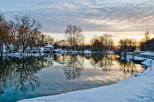 Leaves dances mini funnels over the grass. The sun had just begun to set and a thin, golden arc crowned the autumn-colored treetops and hills.