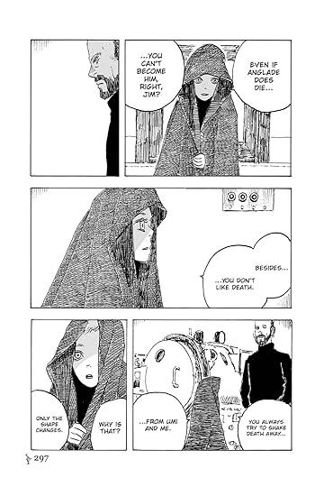 this is the art: the refraction patterns underwater, the leafy shadows from the surface forests, sandy beaches, the wavy sense of movement, the rain streaks, the rippling puddles or rain impacts, the snapping sails, the drumming waves on the boats... all of this creates a world much more... 'tactile', sensual in all ways, than most graphics set more in human worlds, almost like you can feel the heat, feel the seabeeze, taste the saltwater, absorb the red amniotic womb and passage of birth... this world is to me much more effective than usual architecture, monsters, mechanical creations, huge explosions and so on. i can see why this was critically lauded, if not bestseller. this is a manga unlike i have ever read before...