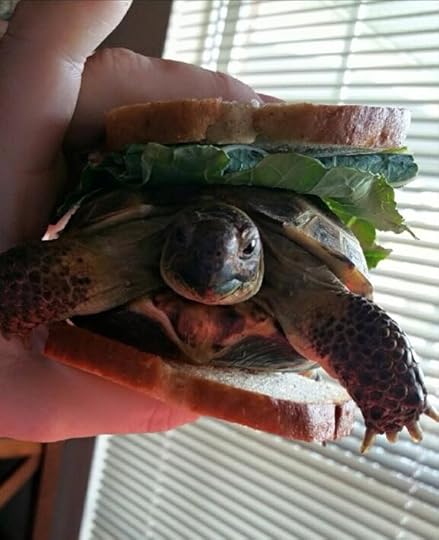 I pulled the car over into the grass and I was holding the turtle almost like I was holding a sandwich.from Nathan Dragon's I think I'm going to try trying.