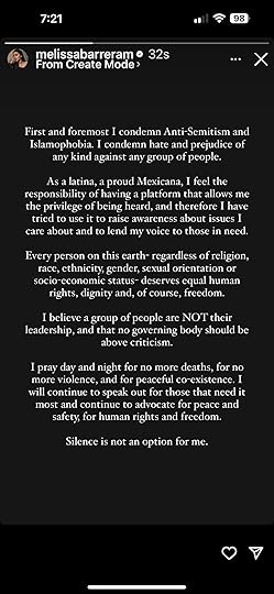 The book also includes Melissa's follow up statement (see below,) in which she reinforces her dedication to using her platform to advocate for human rights. But, yeah, sure, "hate speech." *eyeroll* I don't understand how the text of the book itself doesn't have anything to say about her comments OBVIOUSLY not being hate speech.