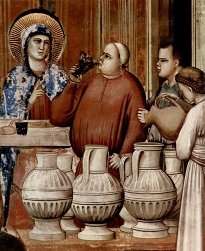 The magnate Arrico Scrovegni built the Chapel in the Arena area of Padua in atonement for his father’s dealings in money -- usury. It is his father, Reginaldo, who is represented in the Apse delivering the Church itself to the Saints. Dante, however, included a usurer in Canto XVII of the Inferno who carried an emblem, a blue sow against a white background, which has been identified as that of the Scrovegni family. This usurer who is quite rude to Dante the pilgrim, would also be Reginaldo.