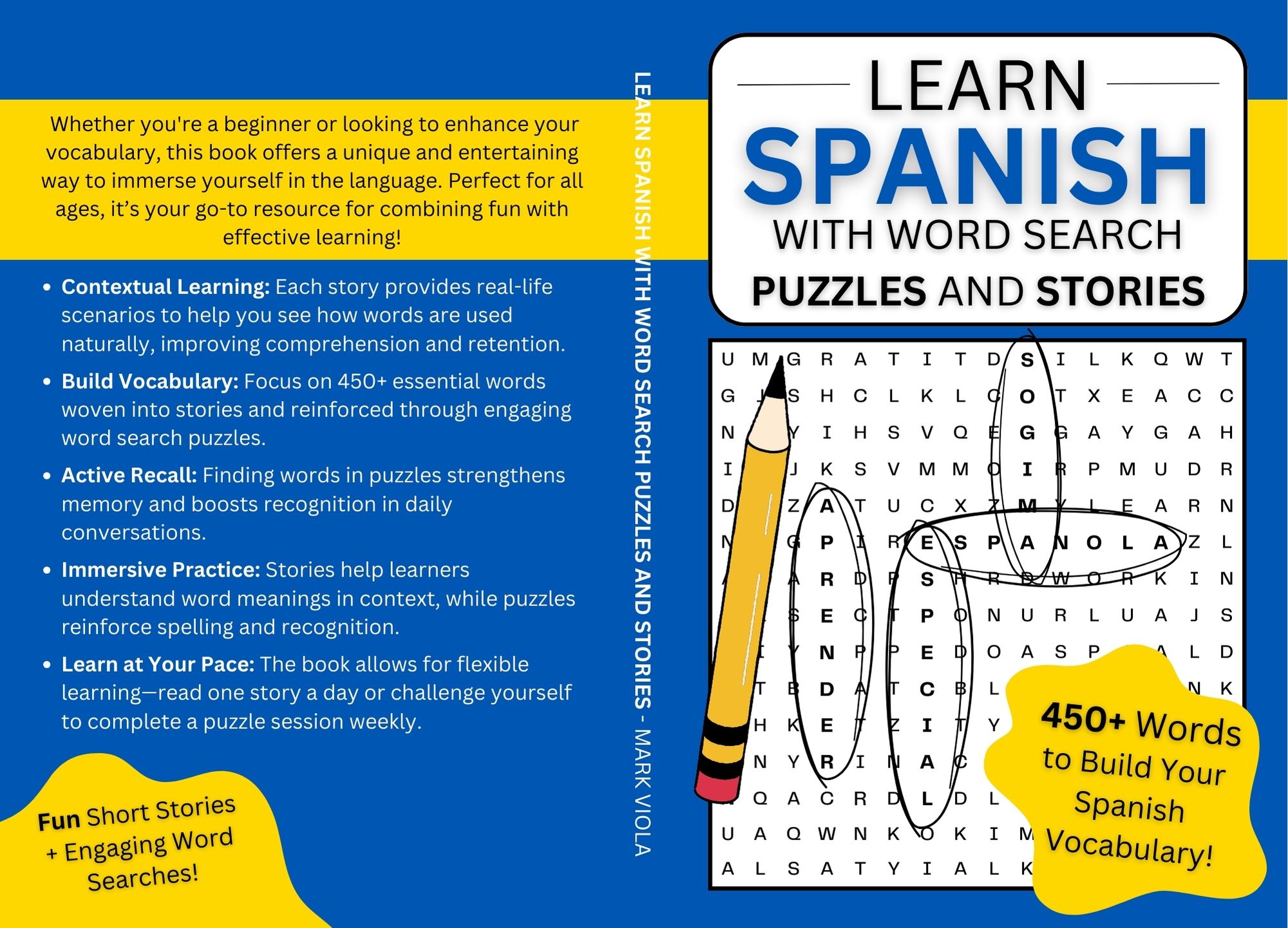 With 450+ essential words, this book uses contextual learning to ensure you not only memorize words but also understand their meaning and usage. Each one-page story immerses you in practical, real-world scenarios, followed by word searches to reinforce learning in an enjoyable format. Perfect for beginners and intermediate learners, this book turns language learning into a rewarding adventure. Whether you're preparing for travel, school, or self-improvement, start your Spanish journey today!