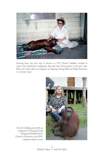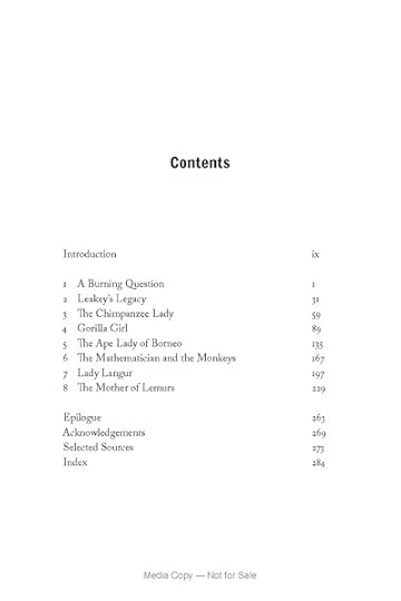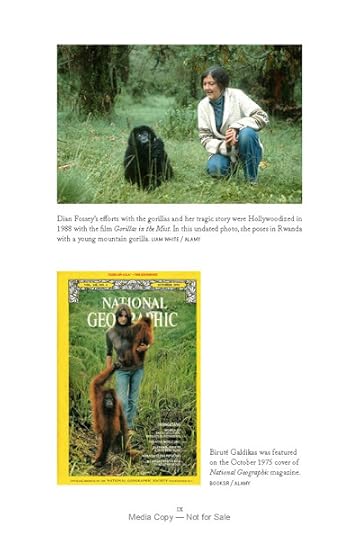In the introduction, McGoogan, herself a primatologist, wonders why so many women have been drawn to study nonhuman primates. She focuses on the six pioneer researchers, each of whom conducted fieldwork on different species of primates in different parts of the world under unique conditions: Jane Goodall (chimpanzees), Dian Fossey (gorillas), Birute Galdikas (orangutans), Jeanne Altmann (baboons), Sarah Hrdy (langurs), and Alison Jolly (lemurs).