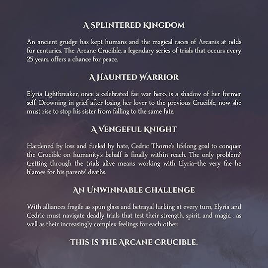 Elyria Lightbreaker is a 250-year-old fae who lost her love (Evander) in the previous Arcane Crucible, a series of deadly trials that grants one winner the Crown of Concord and the opportunity to unite the kingdoms. The next Arcane Crucible is coming up and Evander's sister, Kit, wants to win and find out what really happened to her brother. Despite her efforts to deter Kit from entering, Elyria finds herself in the Arcane Crucible to protect Kit from danger and to help Kit win the crown. Once there, they meet Sir Cedric Thorne, a 27-year-old human knight, along with a cast of amazing side characters. Together, they fight through each trial...barely escaping at times.