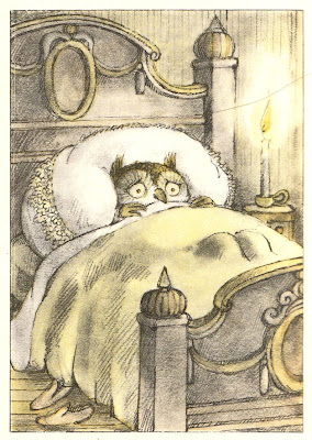 I don't know why I find this so amusing (and seriously, it's one of the funniest books to read to your kids), but each of the five stories in this collection shows our protagonist suffering some level of dementia. And I'm not trying to put some sinister spin on this book unnecessarily. All of these stories find Owl completely alone, usually just trying to find comfort in the solitude of his little house, and usually, he fails. Owl just wants to go to sleep. But something always gets in the way. SPOILER ALERT (is this really necessary for a kids' book?) These stories include the following insights into Owl's fragile mental state: He addresses, at various points, the winter wind as a friend of his, the moon as a tormenter, his own self (a genius stroke by Lobel - he yells up the stairs in an attempt to discover where he actually is - soon afterwards, he is rushing upstairs, feathers flying off of his tail, in pursuit of himself) and his bedsheets. He smashes his bed to pieces in fear of his own legs, and he cries into a teapot by imagining the sad emotions of things such as a pile of mashed potatoes and some misplaced silverware. He then drinks his own tears joyously. There are touches of this kind of mania in Lobel's Frog & Toad stories (Toad screaming at his garden, for instance) but in the end, those stories end up being about the power of friendship. Owl is all alone.