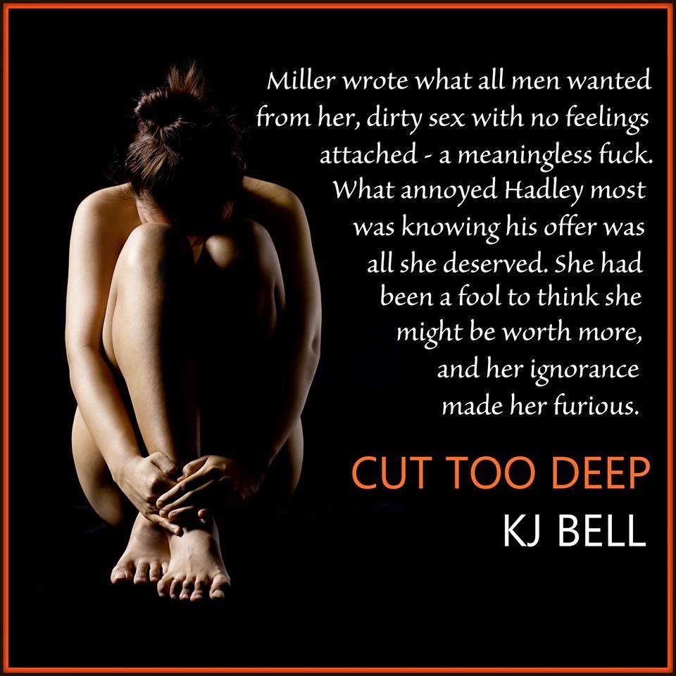 I can't get enough of Miller!!!! Finding love in an unlikely and unexpected place. I love when I can get lost in a book that doesn't have the cookie cutter book boy with the cookie cutter sex scenes and the cookie cutter HEA. KJ Bells's CUT TOO DEEP had me turning the page from the very first chapter. The initial relationship between Miller and Hadley developed over letters. Although the physical attraction may have already been there, the emotional connection between the two became the foundation for their relationship. I really appreciated this aspect of the story. Don't get me wrong, I'm not against sex in a book. In fact I love those books. But if a story doesn't warrant those torrid F* scenes then don't put them in. Yay for KJ Bell for not just adding gratuitous sex for the sake of a sale. It also is much more difficult to write a story than it is to write sex. We all know how sex ends. Do you know how the story ends? But speaking of sex... those moments between Hadley and Miller were so sensual and truly loving. Hadley had a very dark past before Miller and there is no way she would have just jumped into bed with him-- no matter how hot this gorgeous Italian made man was. Cut Too Deep was well thought out and flowed well following the characters secrets. The twist in the story was good. Mac, Hadley's best friend-- I loved his character. he was a great friend that also added some lightness to the story (Hadley's backstory is quite heavy). I really hope there will be a follow up book that will feature Mac. I think that Cut Too Deep, displayed KJ Bell's writing talent well. She is able to write with a sincerity that is both beautiful and sexy. I love that she was able to write about an atypical book boy. He was mature (in his 30's), he worked hard for his money (not just some random billionaire alpha) and family was extremely important to him. Taking care of his own. Hadley was not a pushover or some meek female m/c. She was fun, not overtly beautiful per se (unassuming beauty) and didn't need to rely on a man to get on with life. Cut Too Deep was a well written story and characters. It is definitely worth the time to read.
