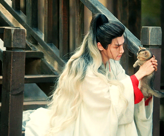 "Mew!" A kittenish cry came from his bossom, and a tiny white paw reached out of his tattered black silk robe. It batteded at the air until the owner realized this wasn't the collar he usually poked his head out, but a new opening. [...]