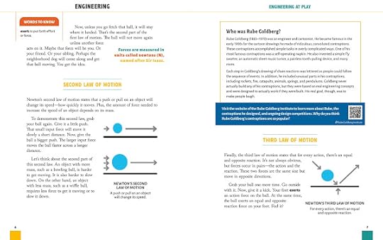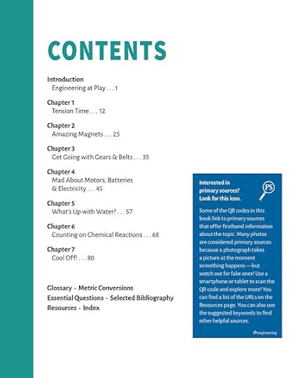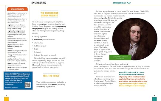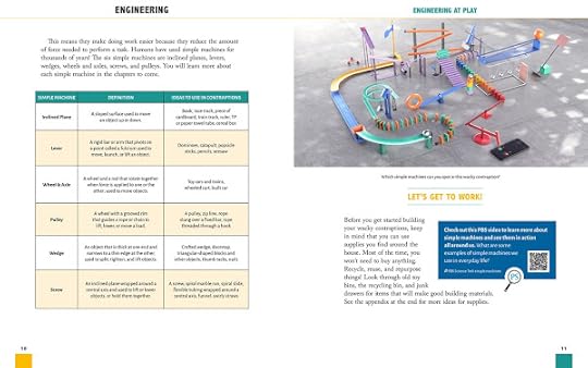 These pages take on the five, basic mechanisms found in the engineering world, explains the basic theories behind them, and then, leads readers into a basic project before opening it up to so much more. Starting with inclined planes, levers, wheel/axle, pulleys, wedges, and screws, these pages then expand them with aspects such as magnets, tension, gears, water, and more. Each chapter covers one of the aspects and explains the basic theories, uses, and such. The information is easy to understand, fits the age group, and flows fine. Sidebars on each page slip in vocabulary words, QR codes to watch videos, and questions to push those thought gears. While this is all written with as much lightness as possible, the fun begins with the projects.