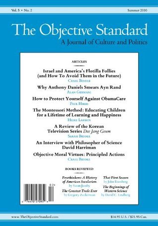 The Summer 2010 issue (Vol. 5, No. 2) features the following articles and Israel and America’s Flotilla Follies (and How To Avoid Them in the Future), by Craig BiddleWhy Anthony Daniels Smears Ayn Rand, by Alan GermaniHow to Protect Yourself Against ObamaCare, by Paul HsiehThe Montessori Educating Children for a Lifetime of Learning and Happiness, by Heike LarsonDae Jang Geum, reviewed by Sarah BiddleAn Interview with Philosopher of Science David HarrimanObjective Moral Principled ActionsFreethinkers (Susan Jacoby), reviewed by Daniel WahlThe Beginnings of Western Science (David C. Lindberg), reviewed by Frederick SeilerThe Greatest Trade Ever (Gregory Zuckerman), reviewed by Daniel WahlThat First Season (John Eisenberg), reviewed by Joseph KellardThe Objective Standard is a quarterly journal of culture and politics written from an Objectivist perspective (Objectivism being Ayn Rand’s philosophy of reason, egoism, and laissez-faire capitalism). The journal is based on the idea that for every human concern—from personal matters to foreign policy, from the sciences to the arts, from education to legislation—there are demonstrably objective standards by reference to which we can assess what is true or false, good or bad, right or wrong. The purpose of the journal is to analyze and evaluate ideas, trends, events, and policies accordingly. We maintain that the standards of both knowledge and value derive from the facts of reality; that truth is discovered only by means of reason (i.e., through observation and logic); that the factual requirements of man’s life on earth determine his moral values; that the selfish pursuit of one’s own life-serving goals is virtuous; and that individual rights are moral principles defining the fundamental requirements of a civilized society. We stand opposed to the notion that the standards of knowledge and value are not factual but subjective (feeling-based) or other-worldly (faith-based); that truth is ultimately dictated by majority opinion or a “supernatural” being’s will; that democratic consensus or “God’s word” determines what is moral; that sacrifice for “the common good” or in obedience to “God’s commands” is virtuous; and that rights are social conventions or “divine decrees.” In stark contrast to these philosophic approaches, ours is a philosophy of reality, reason, egoism, and laissez-faire capitalism.