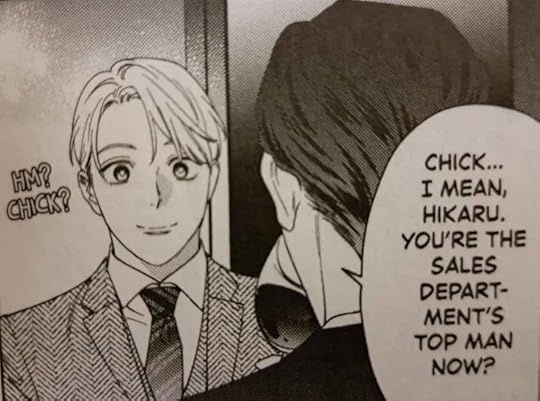 Oh also, the Clark Kent/ Superman of it all was part of the appeal of this series for me, how Shinobu had an entirely different persona at work than at home or the bar. I understand that in order for things to progress, it couldn’t stay like that forever. But his workplace persona was definitely where a lot of Shinobu’s charm came from for me, and having the line between the two get muddled more and more has become less interesting or unique feeling to me. It’s starting to feel like any other bl now, which is a shame.
