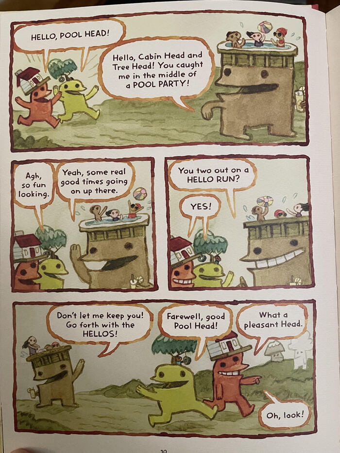 But it didn't really work for meI . I got stuck on the concept of the Heads, especially the ones with people living on them. There's a great spread where Cabin Head and Tree Head are at a lake, and all of the other Heads are around them. On those pages, for a just a moment, the concept clicked for me. But then I went back to just not quite getting it. If there's something to get; if I'm not just overthinking it.