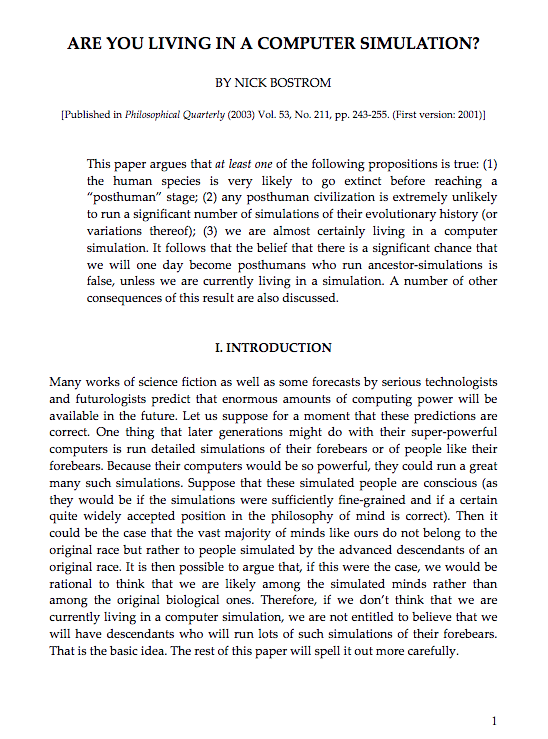1. The fraction of human-level civilizations that reach a posthuman stage (that is, one capable of running high-fidelity ancestor simulations) is very close to zero.