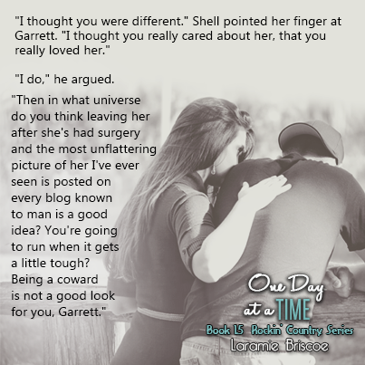 One Day At A Time was an amazing book. When I was done reading it I could not stop smiling. One of my most favorite things about Laramie Briscoe is that she blows me away with the development of her characters. A lot of times when I have read a series it is only the main characters that are fully developed and it was refreshing to see that even our beloved secondary characters like Jared, Shell, Brad and Stacey were developed beautifully in this book.