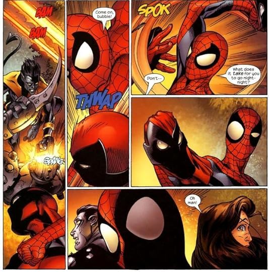 But it's not just the story that's crowded, the art is crowded too. Bagley's art has been as vital to the series as Bendis's writing. He is THE artist I think of when I think of Spider-Man, even though his long run on Ultimate Spider-Man isn't / wasn't / who knows anymore / part of Marvel's canon. My one gripe with his work has been that the way he lays out a story over two pages can be confusing, as he ometimes treats them as two separate pages where you read the action traditionally, and sometimes wants you to read across the two pages, and it's not always clear which techniue he's using. But this particular volume was headache inducing. The Frank Miller Dark Knight Regurgitates talking head panels above and below the action were frustrating enough, but his two page action spreads are just sloppy. Since Bendis't use of the talking heads wasn't making the story any more interesting, I started skipping them, and then ended up just flipping through the pages to get to the next storyarc.