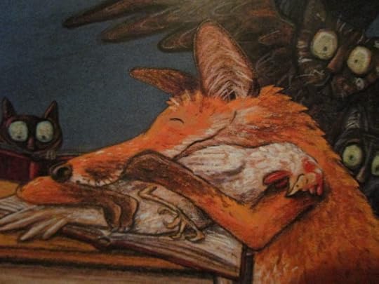 Anyway, things happen and there doesn't seem to be much of a through-line but I loved the chicken and fox falling asleep together and the ending with the fox reading books with chickens. Apparently, the chicken has taught him how to read.