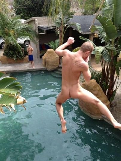 Photo Description: Picture shows a blond man, naked, midair in a jump into a pool, and another man across the pool taking a picture of him.