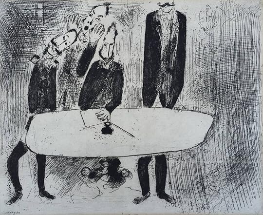 In Chapter 5 the focus shifts to Chagall and Léon Samoilovitch Bakst. Chagall I imagine you've all heard of, but perhaps you haven't heard of Bakst. He was a painter, costume maker and set designer. There is a lot of information about him out there if you want to look. Bakst was one of Chagall's early and influential teachers (they worked on sets together for the Russian ballet) and in a roundabout way led him to Paris. But Bakst didn't help Chagall or see him much in Paris. Chagall managed on his own. Meisler describes Chagall's social and therefore business skills as much more refined than Soutine's. (In other words, Chagall had them.) Chagall starts in Russia, goes to Paris, goes back to Russia during WWI, and in the 20s goes back to Paris. This is an interesting chapter. It ends with Chagall being commissioned to do etchings for Gogol's Dead Souls.