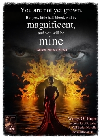 If you've read the first two books in The Veil series, and loved them as much as I did, you won't want to miss Wings of Hope, where we catch a glimpse into Muse's life as a half-demon beyond the veil. In the netherworld, Muse has been kept as a plaything for the ruthless demon, Da'mean. Hundreds of years have passed, where she never imagined a life outside her confines. But when she meets Mammon, everything changes.
