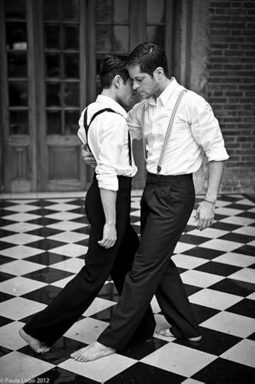 Photo Description: Two dark-haired, slimly built men are dancing close to each other in the middle of a black-and-white, checkered dance floor. They are wearing dark dress pants with suspenders, white dress shirts, and both are barefoot.