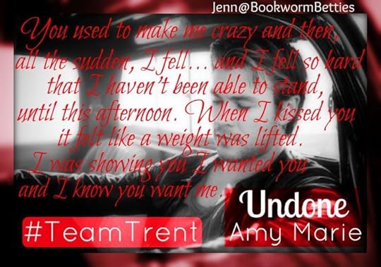 Undone by Amy Marie is book two in the Unexpected Series. A story of an unexpressed love that will have your heart breaking at times and cause you to smile at others. I can guarantee that the reader will fall in love with Trent Decker and his adorable son; wanting nothing for him but the returned love of the only woman he has loved; even if it is his sister's best friend. This book was a 3.5 star read for me and I would recommend this series to those who enjoy a love story with conflict, angst and of course a happily ever after.