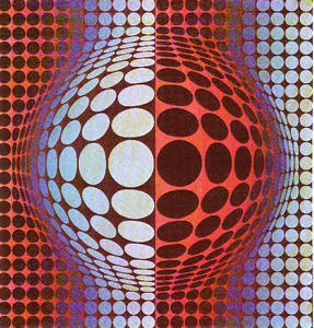 Here is another quote from Diehl underscoring the transcendent quality of Vasarely's geometric art: "The subtle dislocations arranged, and the numerous sharp angles, give the composition an appearance that is intermediate between pure spirituality and nature; that is: they lead to a geometry made all the more vivid by the fact that the force of the contrasts emphasizes its radiating luminosity."