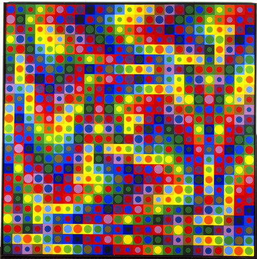 VEGA-WA-3 We have the geometry of circles, twenty-three circles on the vertical and twenty-two on the horizontal for a total of five-hundred-and-six circles, but these circles are not simply static, rather, the circles bulge out at the center, as if the vinyl canvas is a flexible rubber sheet and a ball is being pushed from the rear toward the viewer creating the illusion of three-dimensionality. The circles on the left are black on a burnt orange background and the circles on the right are light gray on a black background and as the shapes change via the pushed ball so the color of both the circles and background change into one another - a unique metamorphosis, the cross-transformation of both color and form.