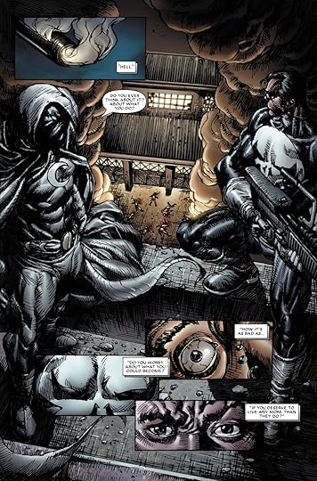 In fact, it really (and I can't BELIEVE I'm typing this) helped everything move forward in a pretty fluid way. Throughout different issues, Marc is visited by Spider-man, Steve Rogers, and Tony Stark. And in an almost hilarious turn of events . Of course, threats are made that his brand of violent justice won't be tolerated, and he needs to get on board with some normal heroing...or else.