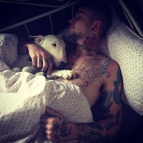 Photo Description: A man naps on his back on a daybed, a floral sheet pulled up to mid-chest. His right arm is curled around a white bull terrier, whose head and paw rest over the large winged tattoo on the man’s chest. A smartphone is clutched in the man’s right hand. His ears, nipples and right nostril are pierced. Tattoos can be seen on his upper chest, shoulder, and all down his left arm.